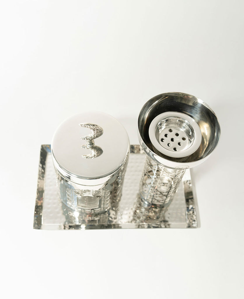 Description: This elegant three-piece Bakhoor Set includes a sleek tray, a glass jar covered in intricately cut Aluminum with an oriental-inspired design, and a matching bakhoor stand. The jar is finished with a refined lid topped with a crescent moon, adding a meaningful and decorative touch.